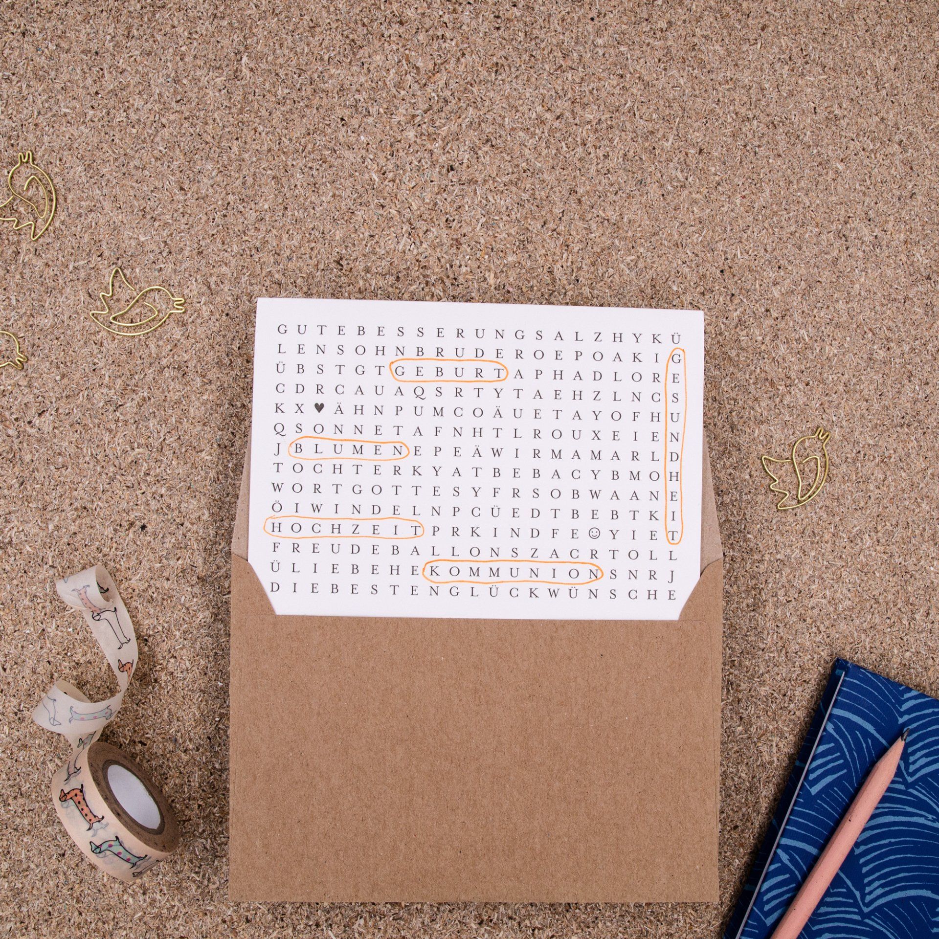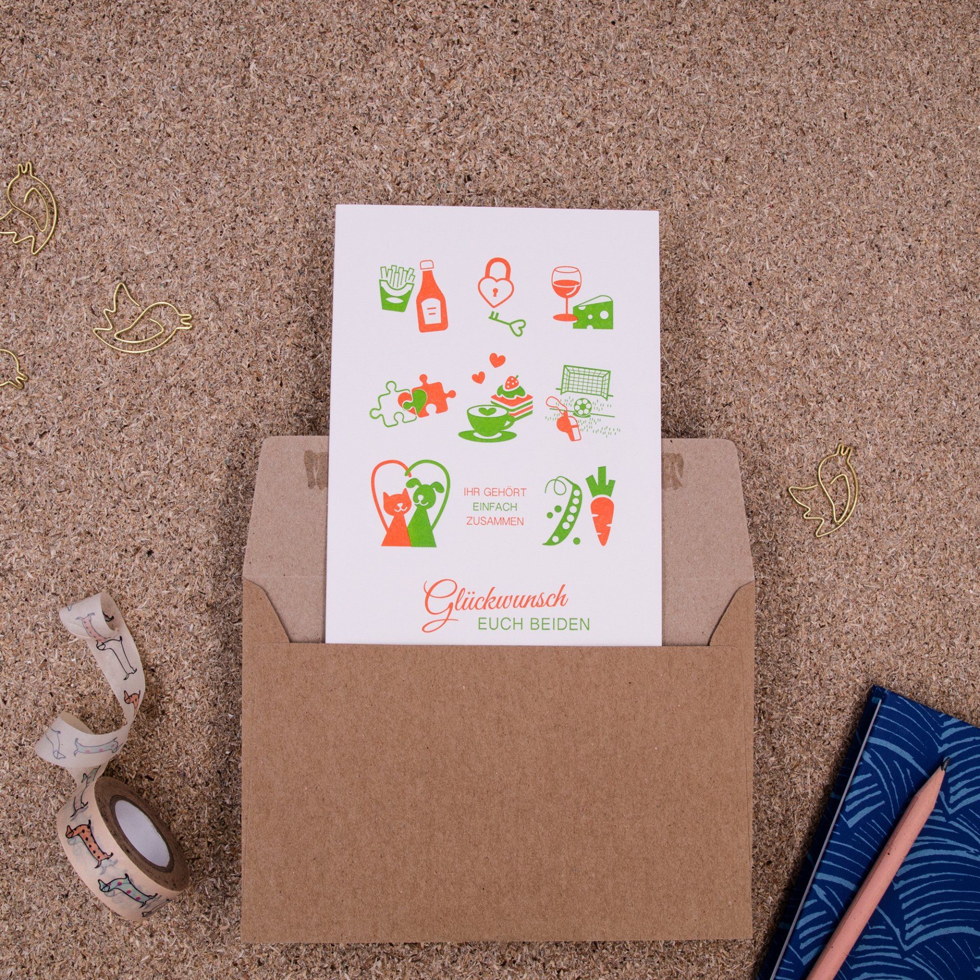 Ich biete im Letterpress-Verfahren (Buchdruck) geprägte feine Klappkarten und Postkarten. Meine Klappkarten liefere ich mit einem braunen Umschlag aus 100% Recyclingmaterial. Auf Wunsch können die Klappkarten auch ohne transparente Schutzhülle "naked" geliefert werden.